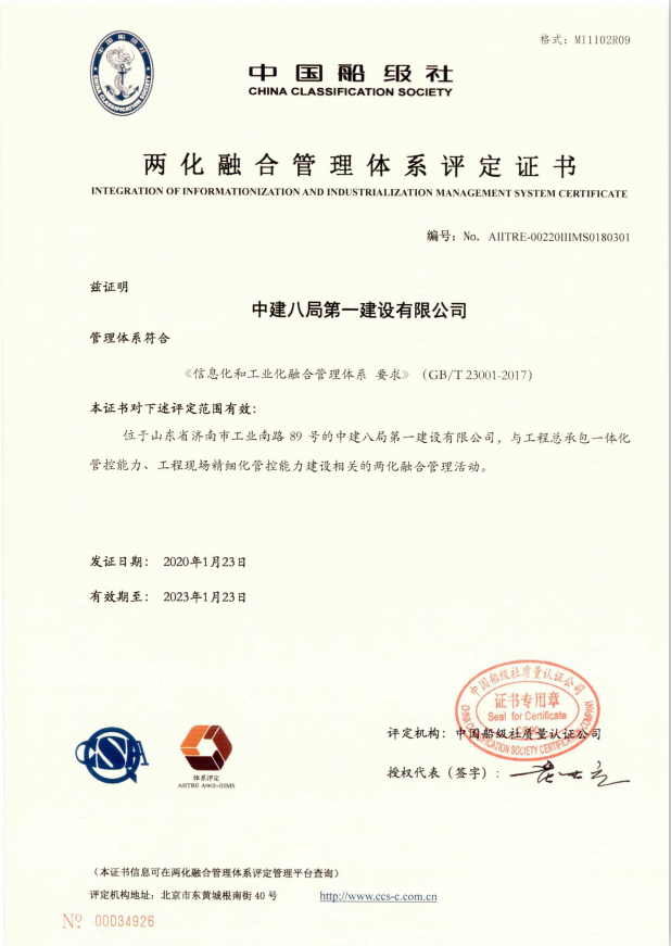 近日,中建八局一公司兩化融合管理體系通過工信部審核并公示,順利取得中國船級社頒發(fā)的《兩化融合管理體系評定證書》,評定范圍包含:工程總承包一體化管控能力、工程現(xiàn)場精細化管控能力建設相關的兩化融合管理能力。這標志著其成為山東省首家獲得此項權威認證的建筑企業(yè),也是中建集團系統(tǒng)首家獲得此項認證的施工總承包企業(yè)。