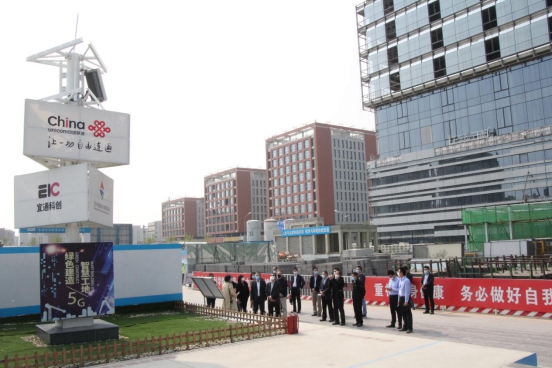 李如生、毛志兵一行進入項目施工現場后,對項目5G智慧工地開展情況、疫情防控管理、生產建設情況、安全管理等多個方面進行調研。在項目5G智慧建造體驗中心,李如生詳細了解5G智慧工地項目的啟動背景、5G智慧工地方案架構“一通、多能、四驅動”,對運用的5G實名制雙防監(jiān)管系統(tǒng)、5G可移動建筑職業(yè)健康分析系統(tǒng)等智能技術應用展開交流探討,并體驗了5G健康亭、AI眼鏡、AI識別平臺,了解5G技術對于項目疫情防控、助力復工復產的重要作用。