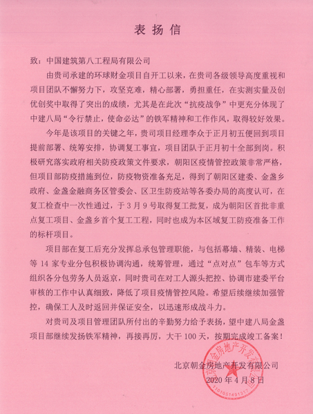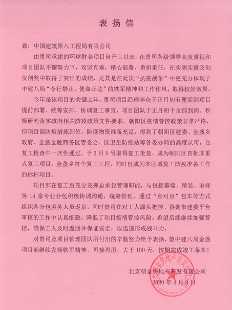 4月9日,北京金盞項(xiàng)目喜獲業(yè)主單位招商局地產(chǎn)發(fā)來的表揚(yáng)信,信中對項(xiàng)目部在實(shí)測實(shí)量及創(chuàng)優(yōu)創(chuàng)獎中取得的突出成績,在“抗疫戰(zhàn)爭”中防控工作、組織復(fù)工等方面的工作給予高度評價。
