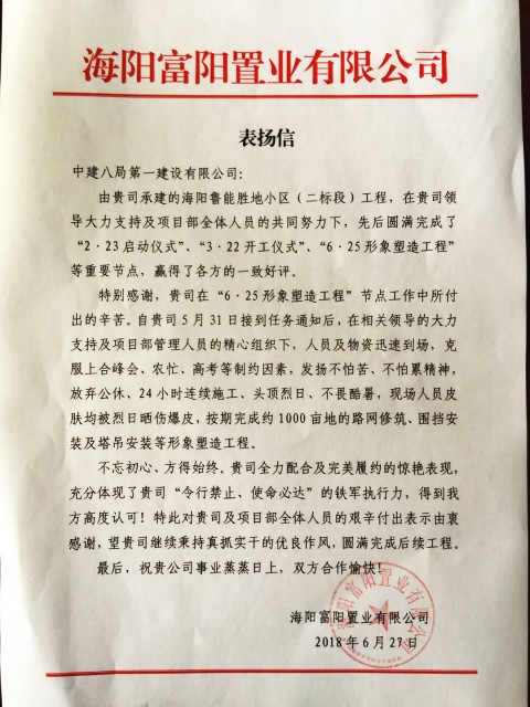 經(jīng)過25天縝密籌劃,爭分奪秒的戰(zhàn)斗,海陽魯能勝地小區(qū)(二標段)項目順利完成了“6·25形象塑造工程”節(jié)點,喜獲業(yè)主表揚信。