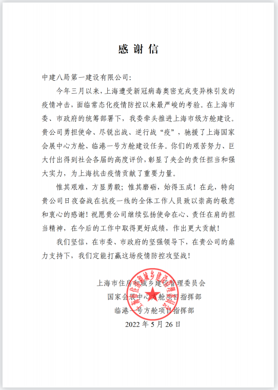 5月26日,上海市住建委、國家會展中心方艙項目指揮部、臨港一號方艙項目指揮部發(fā)來感謝信,肯定中建八一在本次上??箵粢咔橹胸暙I的重要力量!