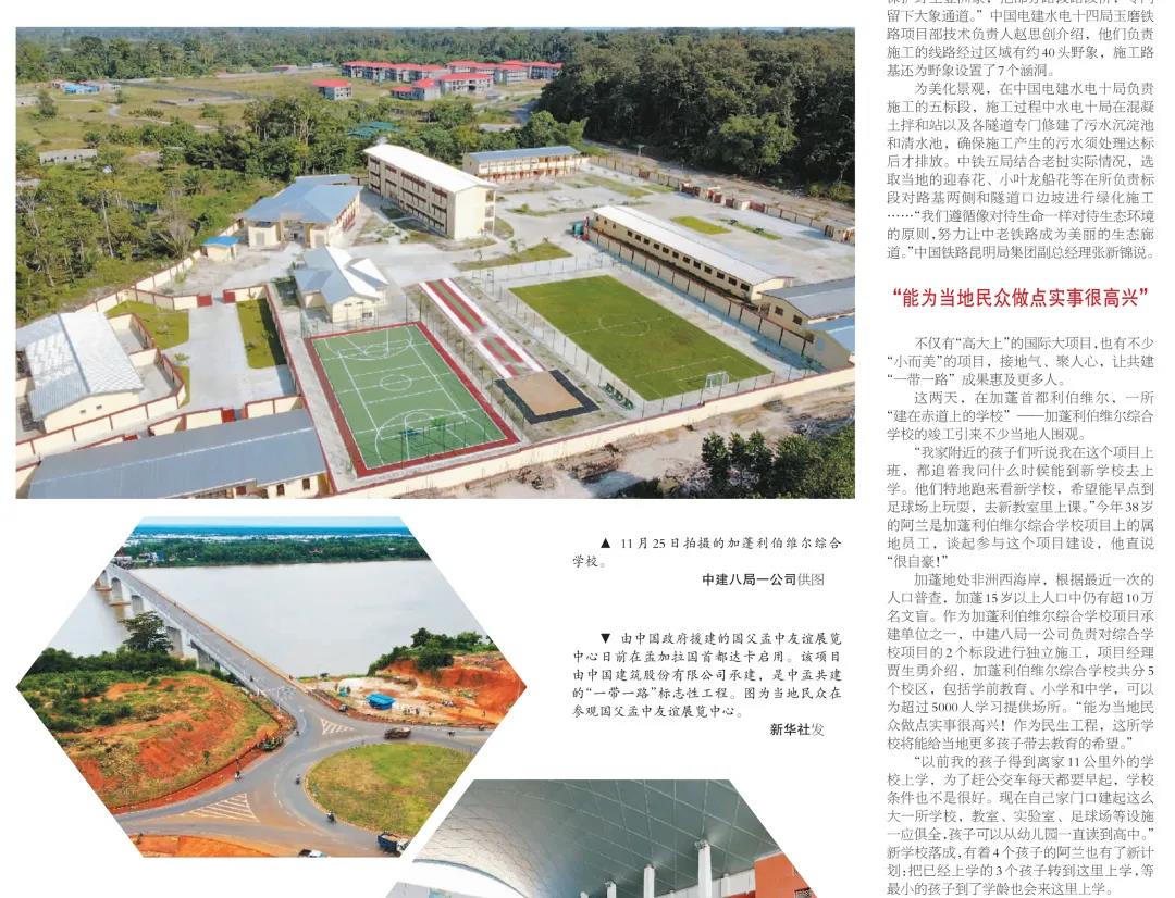 11月30日,《人民日報》刊文《又一批“一帶一路”項目建成了! 多個由中企承建海外工程近期完工》點贊報道中建八局一公司在“赤道上”參建的加蓬利伯維爾綜合學(xué)校項目。