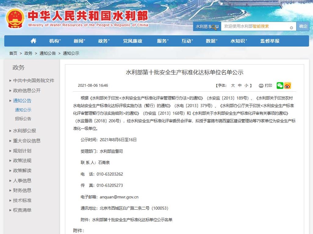 8月6日,國家水利部官網(wǎng)公示了第十批水利安全生產(chǎn)標(biāo)準(zhǔn)化達(dá)標(biāo)單位名單,中建八局一公司等79家單位認(rèn)定為水利安全生產(chǎn)標(biāo)準(zhǔn)化一級(jí)達(dá)標(biāo)單位!