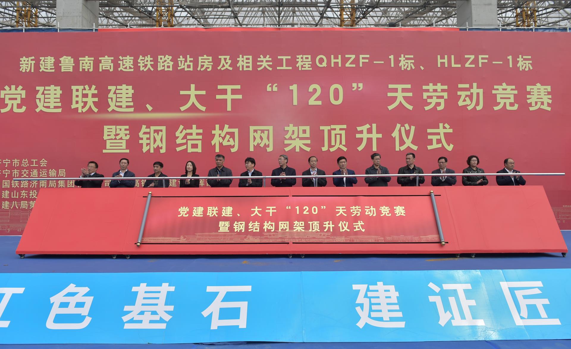 建功新時代,奮進(jìn)新征程。 4月15日,魯南高鐵站房項(xiàng)目在濟(jì)寧北站舉行黨建聯(lián)建、大干“120天”勞動競賽暨“鋼結(jié)構(gòu)網(wǎng)架頂升”儀式,以黨建促進(jìn)生產(chǎn),以競賽激發(fā)斗志,吹響奮進(jìn)攻堅(jiān)沖鋒號。