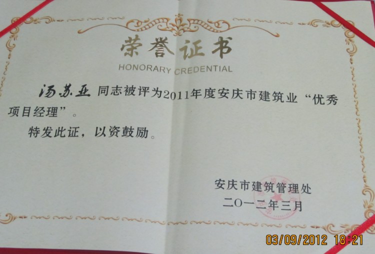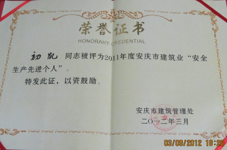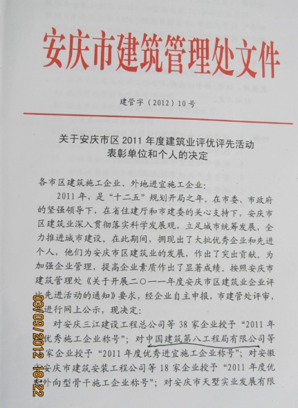 3月9日,安慶市建委隆重召開2011年度全市建筑業(yè)評優(yōu)評先暨總結大會,我局榮獲“優(yōu)秀進宜施工企業(yè)”榮譽稱號、一公司湯蘇亞、初凱分別榮獲“優(yōu)秀項目經理”、“安全管理先進個人”榮譽稱號。