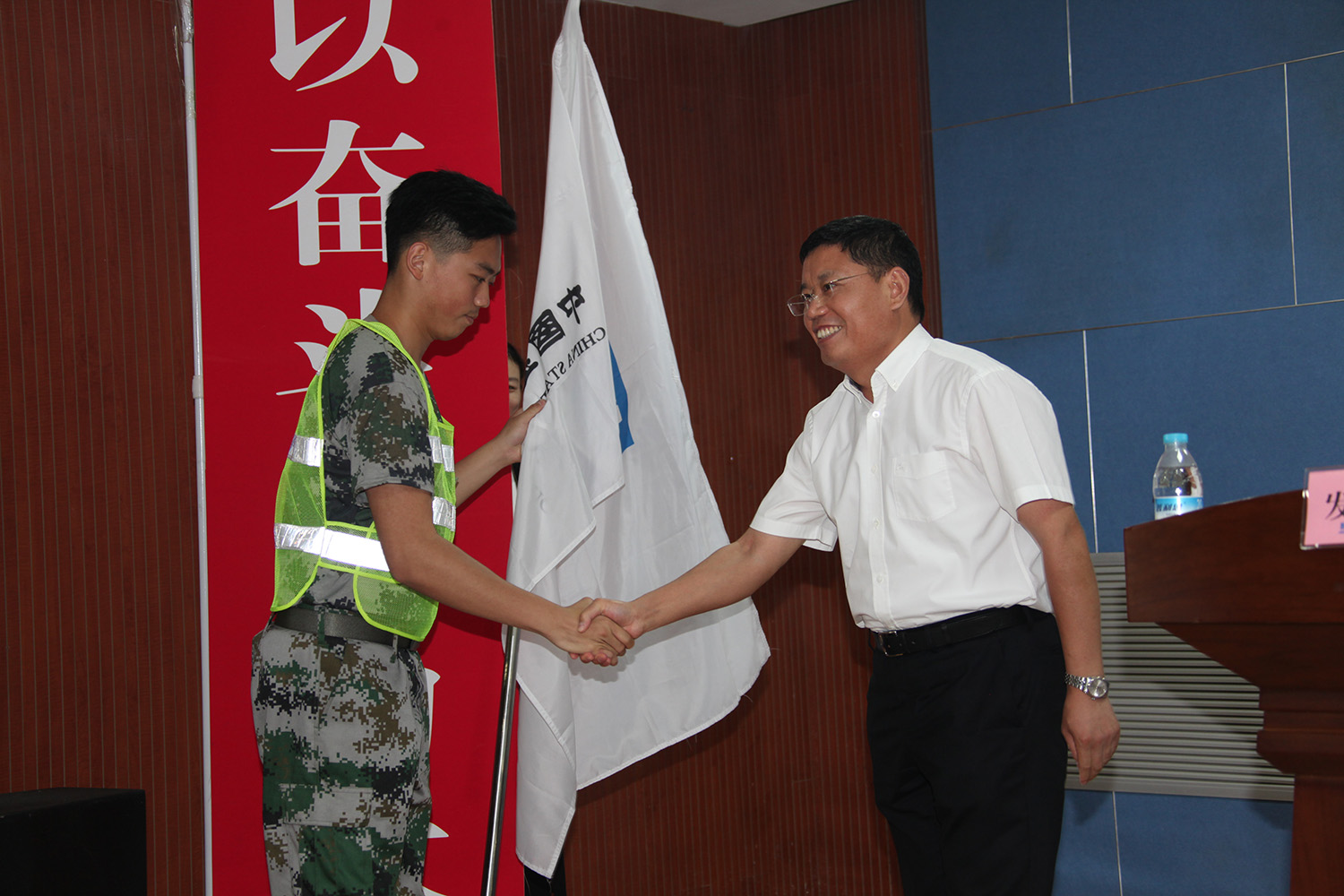 公司董事長、黨委書記李永明向新員工代表授中建司旗