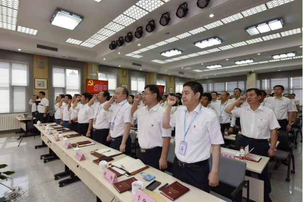 上午九點(diǎn)整,大會在雄壯的國歌聲中正式開始。隨后,在哈小平的領(lǐng)誓下,公司及各分會場黨員,面對鮮艷的中國共產(chǎn)黨黨旗,舉起右拳,重溫入黨誓詞。