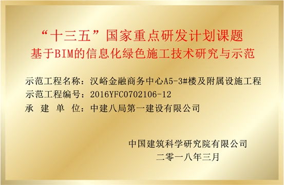 8月15日,漢峪金融商務(wù)中心A5-3#樓及附屬設(shè)施工程“雙喜臨門”,由中國建筑科學(xué)研究院頒發(fā)的“十三五”國家重點(diǎn)研發(fā)計(jì)劃課題《基于BIM的信息化綠色施工技術(shù)研究與示范》銅牌和中建八局頒發(fā)的“二0一八年度科技成果轉(zhuǎn)化示范工程”銅牌在我項(xiàng)目成功掛牌立項(xiàng)。