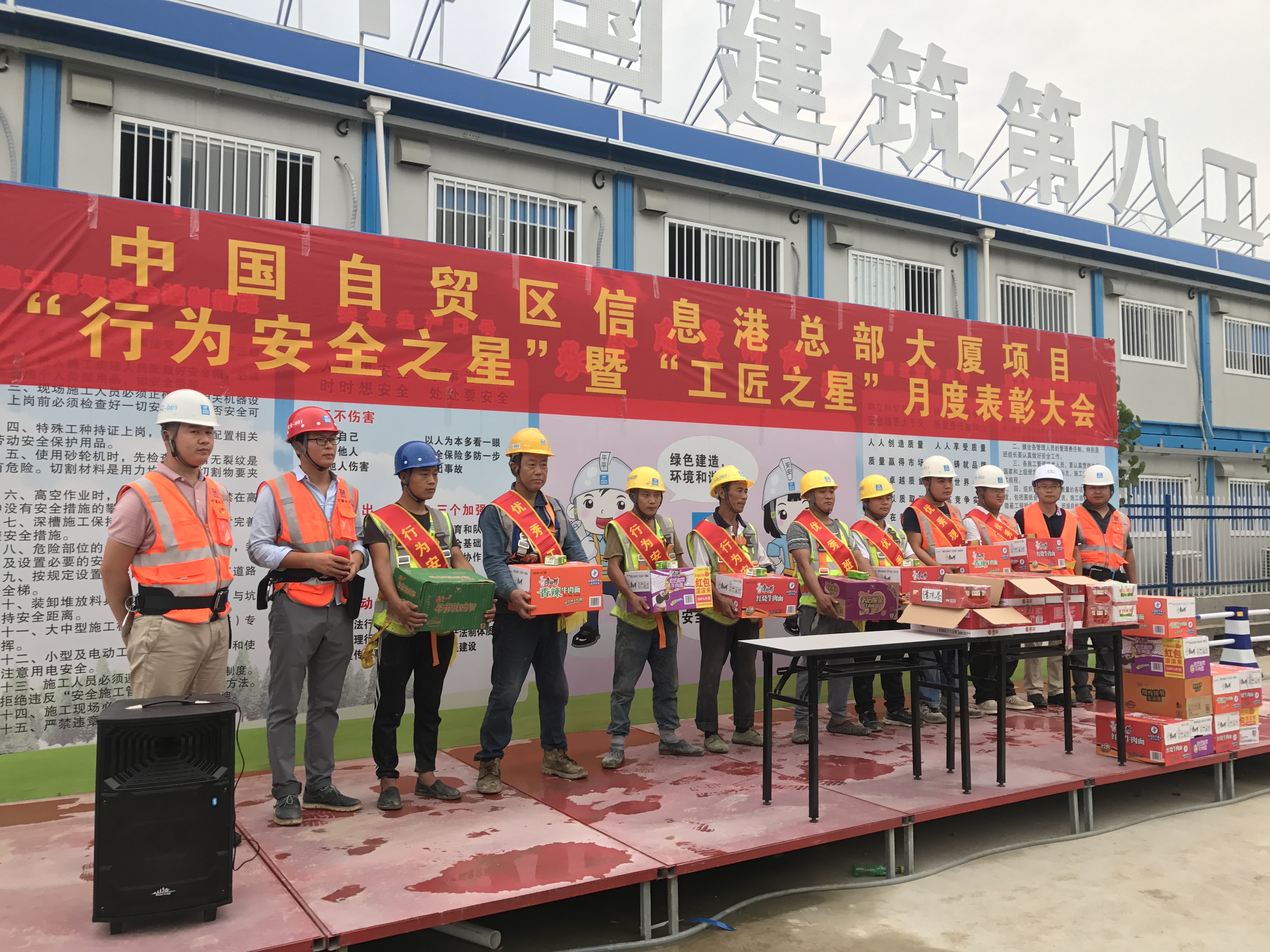 8月26日下午,公司中國自貿(mào)區(qū)信息港總部大廈項(xiàng)目部組織所有管理人員和分包單位管理人員及現(xiàn)場作業(yè)人員,舉行了八月“行為安全之星”暨“工匠之星”表彰大會(huì)。