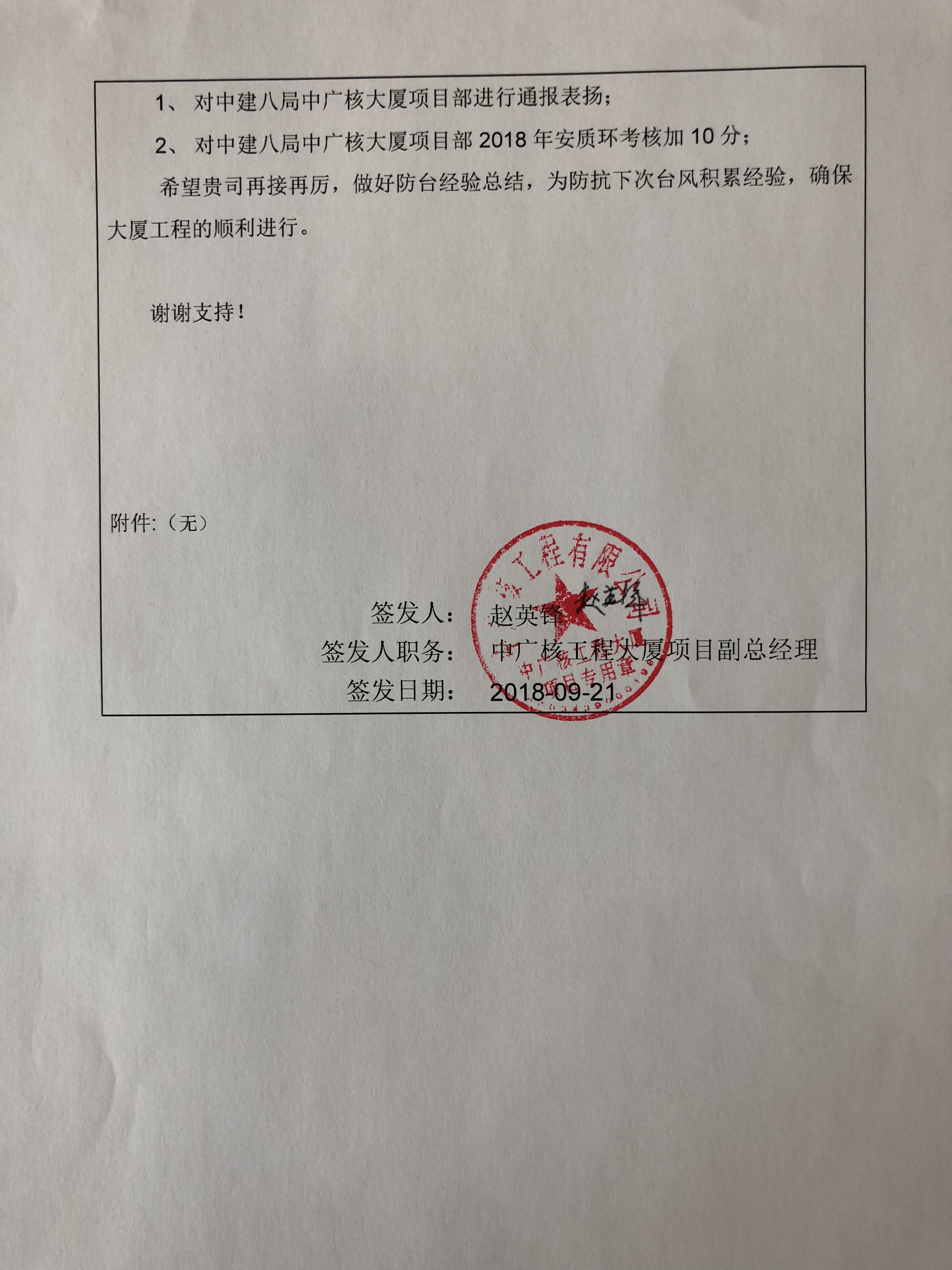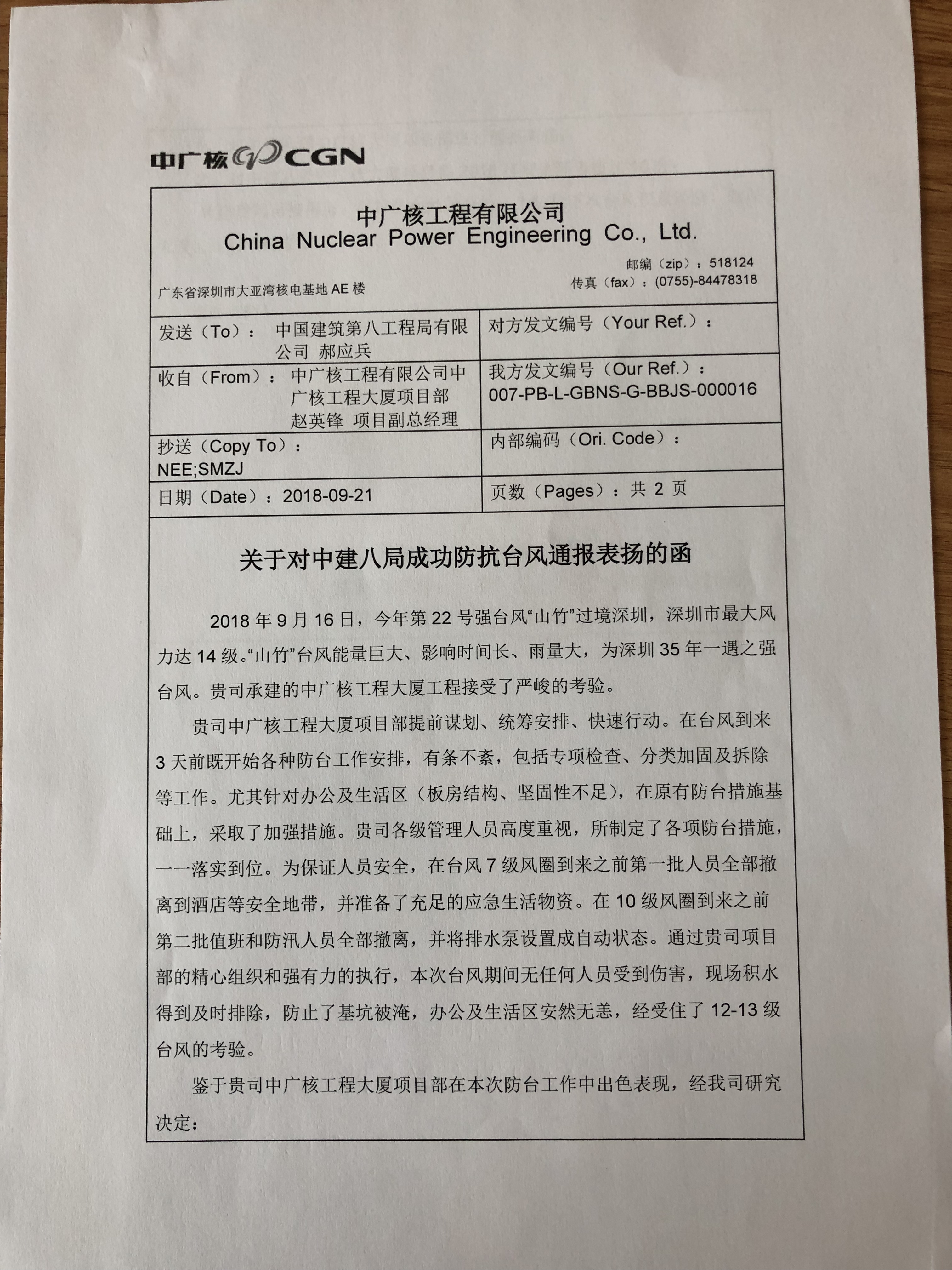 近日,中建八局華南分局收到來自業(yè)主中廣核工程有限公司的表揚信,對公司中廣核工程大廈項目在開工后現(xiàn)場實施狀態(tài)以及項目部全體成員應對超強臺風“山竹”的出色表現(xiàn)進行表揚及感謝。