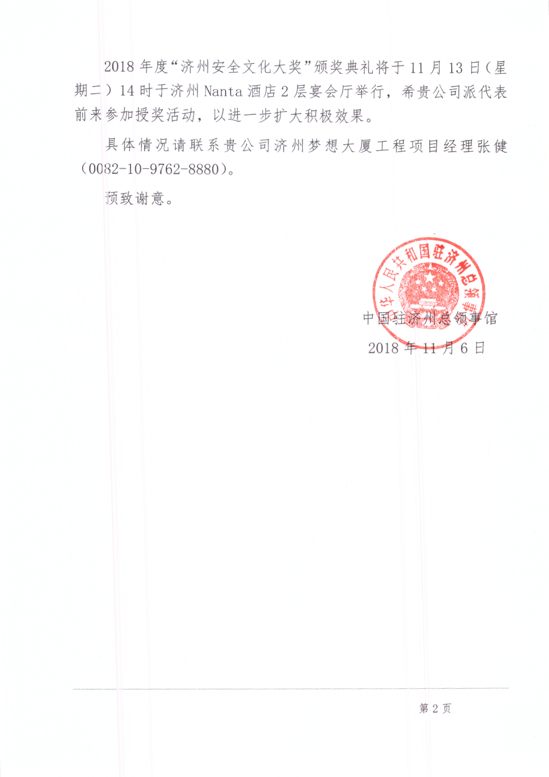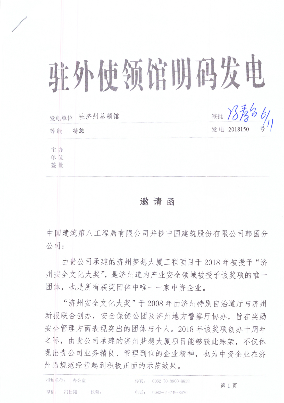 11月6日,駐外使領(lǐng)館明碼發(fā)電,濟州總領(lǐng)事馮春臺親自簽批邀請函,公司將作為濟州道內(nèi)產(chǎn)業(yè)安全領(lǐng)域被授予該獎項的唯一團體,也是唯一的中資獲獎企業(yè),受邀參加13日在濟州Nanta酒店舉行的頒獎典禮。