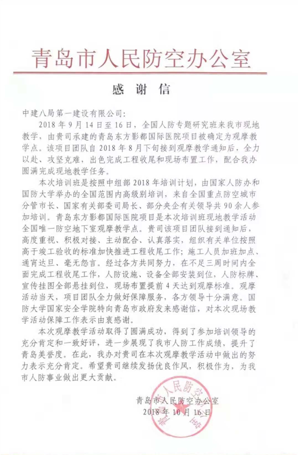近日,青島萬(wàn)達(dá)東方影都國(guó)際學(xué)校、醫(yī)院項(xiàng)目部收到了青島市人民防空辦公室發(fā)來(lái)的表?yè)P(yáng)信。信中著重肯定了我司在全國(guó)人防專題研究班現(xiàn)地教學(xué)活動(dòng)中的突出貢獻(xiàn),贊揚(yáng)我公司能夠積極配合青島市人防辦開展工作,顯示出較強(qiáng)的大局意識(shí)、政治意識(shí)和較高的工作水平,同時(shí)肯定了公司的優(yōu)良作風(fēng)并對(duì)后序工程項(xiàng)目工作的寄于厚望。