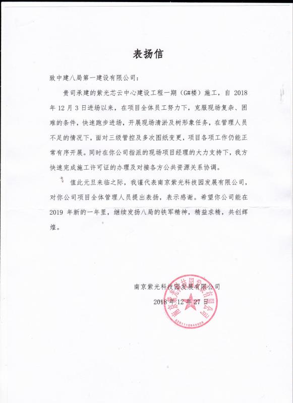 近日,南京紫光芯云中心建設(shè)工程一期G#樓項目,入場短短20天時間,喜獲業(yè)主單位表揚信。又恰逢元旦到來之際,此次表揚給予了項目全體員工極大的鼓舞和斗志。