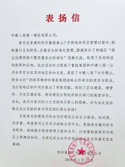 近日,蘇地2016-WG-57號西地塊項(xiàng)目收到魯能廣宇置業(yè)有限公司對項(xiàng)目部的表揚(yáng)信,信中對公司工程施工給予了高度評價(jià)及肯定,并對項(xiàng)目團(tuán)隊(duì)的團(tuán)結(jié)協(xié)作提出表揚(yáng)。