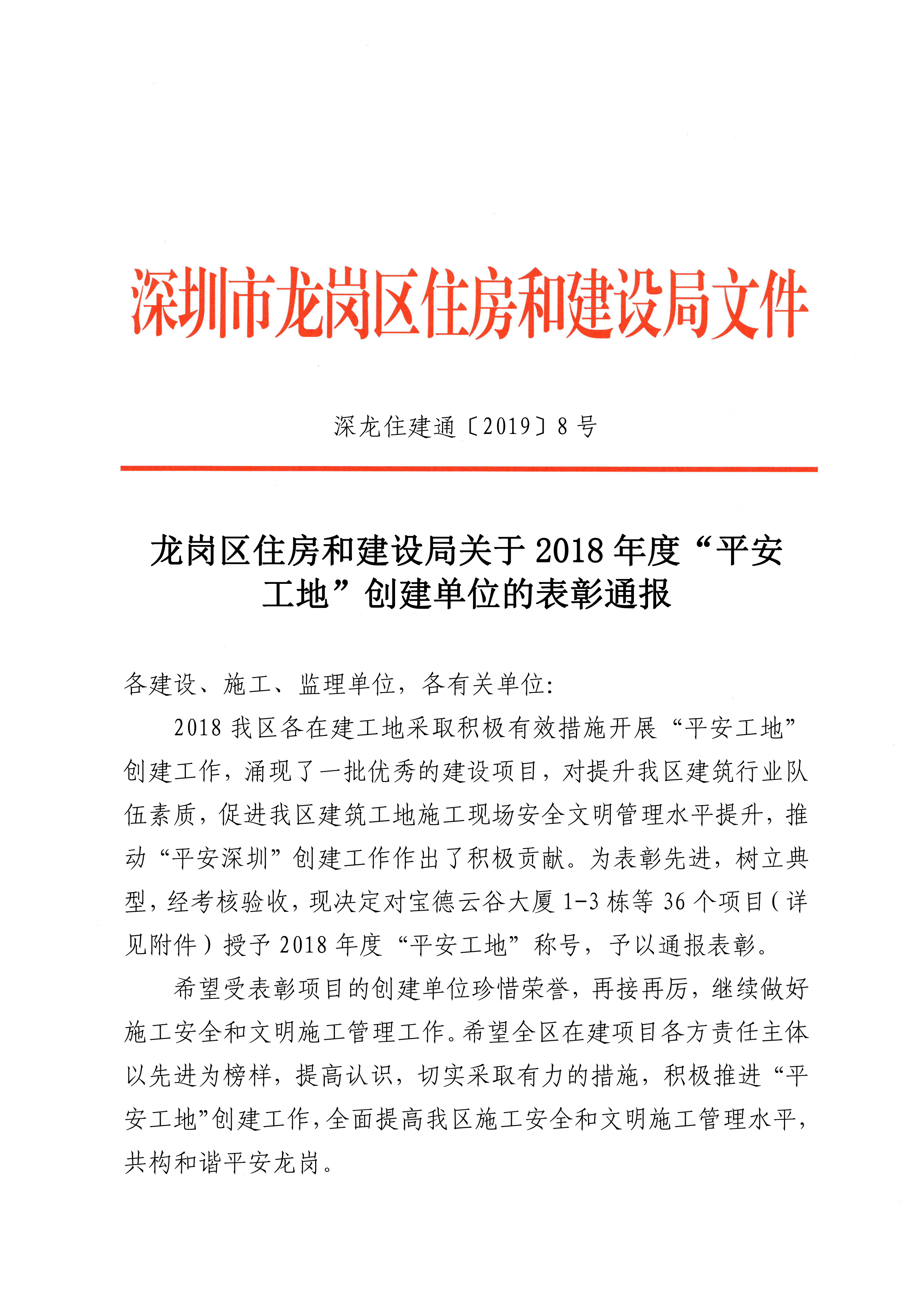 《龍崗區(qū)住房和建設(shè)局關(guān)于 2018 年度“平安工地”創(chuàng)建單位的表彰通報(bào)》
