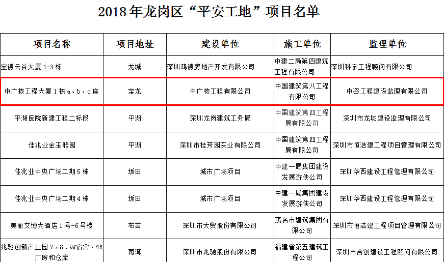 2018年龍崗區(qū)“平安工地”項(xiàng)目名單