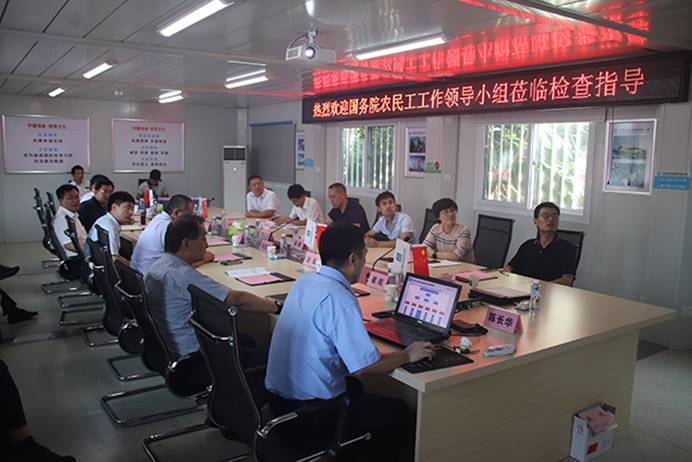 項目經理陳長華簡要介紹了項目實際情況,并針對農民工工資發(fā)放情況進行了重點匯報。匯報結束后,國務院農民工工作領導小組按要求對項目的資料進行了嚴格的檢查,并邀請了幾位農民工代表進行談話,從是否簽訂勞動合同,是否及時收到工資等方面了解項目農民工工資發(fā)放工作的落實情況。