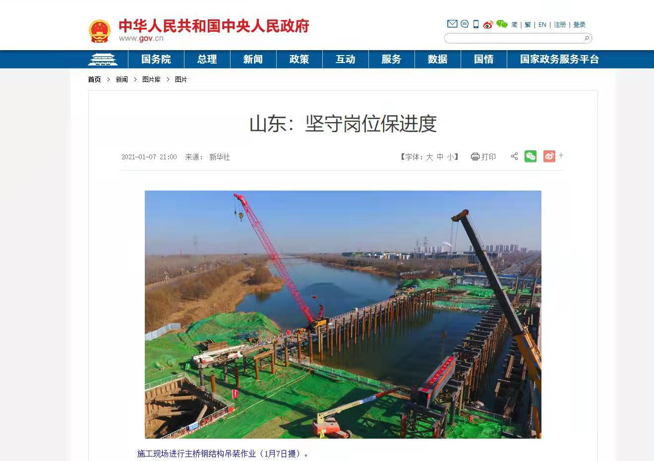 1月7日,聊城市黑龍江路跨徒駭河大橋,在-19℃嚴(yán)寒中進(jìn)行了首次鋼結(jié)構(gòu)主縱梁桿件吊裝。當(dāng)晚,國務(wù)院官網(wǎng)點(diǎn)贊中建八一建設(shè)者不畏嚴(yán)寒、堅守崗位保證重點(diǎn)民生工程履約推進(jìn)的事跡。