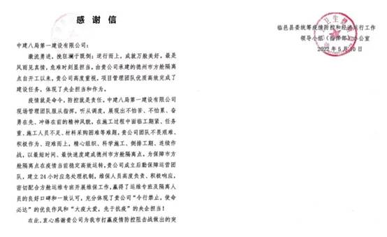 臨邑縣衛(wèi)生健康局發(fā)來(lái)感謝信,信中提到中建八一建設(shè)團(tuán)隊(duì)和后勤保障運(yùn)營(yíng)團(tuán)隊(duì)用實(shí)際行動(dòng)贏得良好口碑,充分體現(xiàn)出中建八一“令行禁止,使命必達(dá)”的優(yōu)良作風(fēng)和“大疫大愛,先于抗疫”的央企擔(dān)當(dāng)。