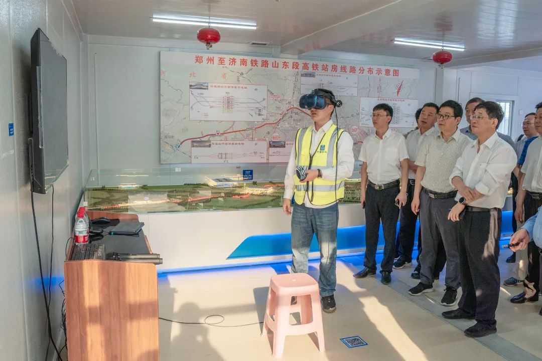 王同軍一行來到聊城西站升降式沙盤室,聽取了濟(jì)鄭鐵路山東段高鐵線路走向、聊城西站建設(shè)規(guī)模、設(shè)計理念、工期計劃等方面的匯報,通過VR詳細(xì)了解了工程內(nèi)外裝飾整體效果。