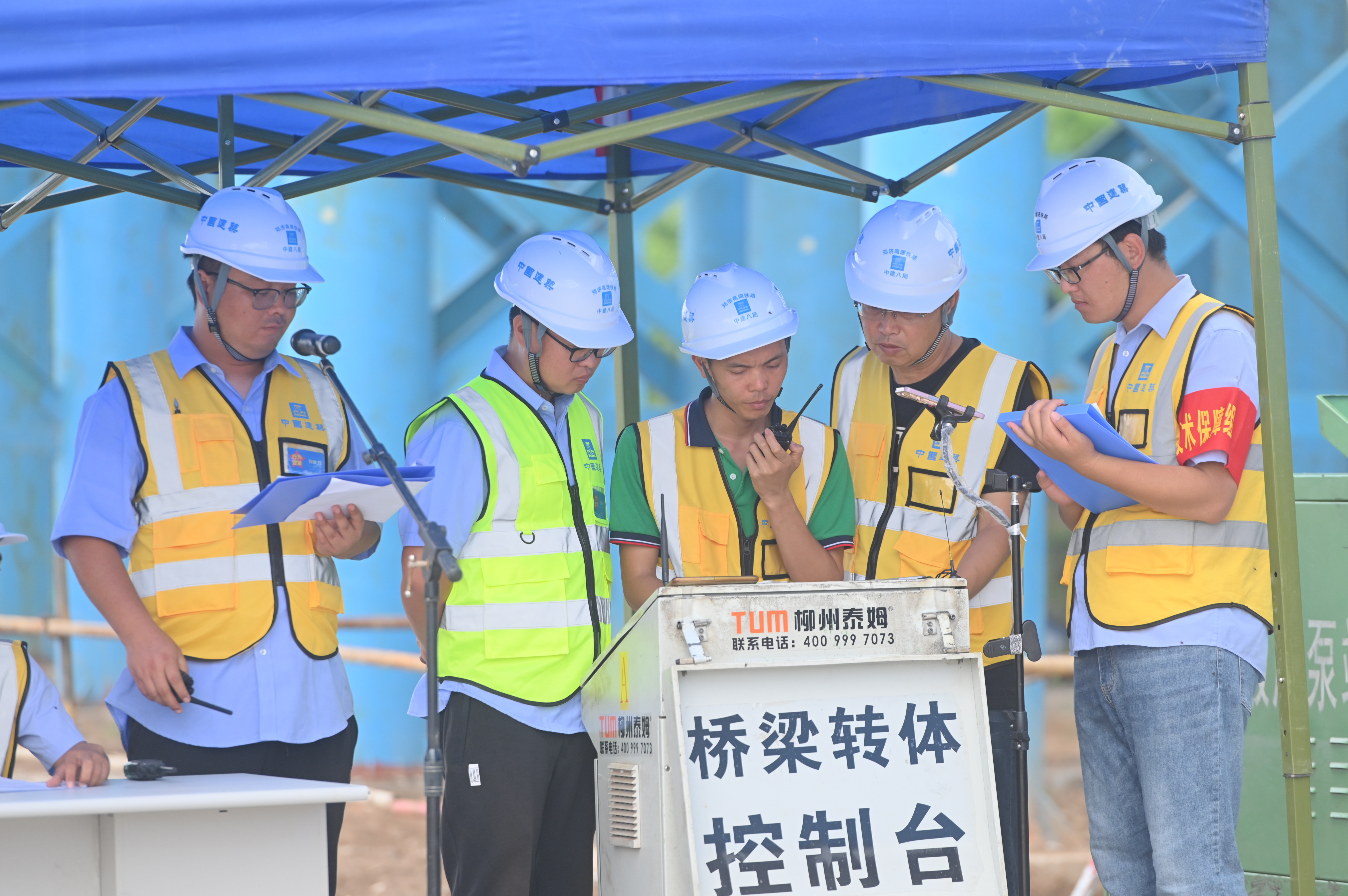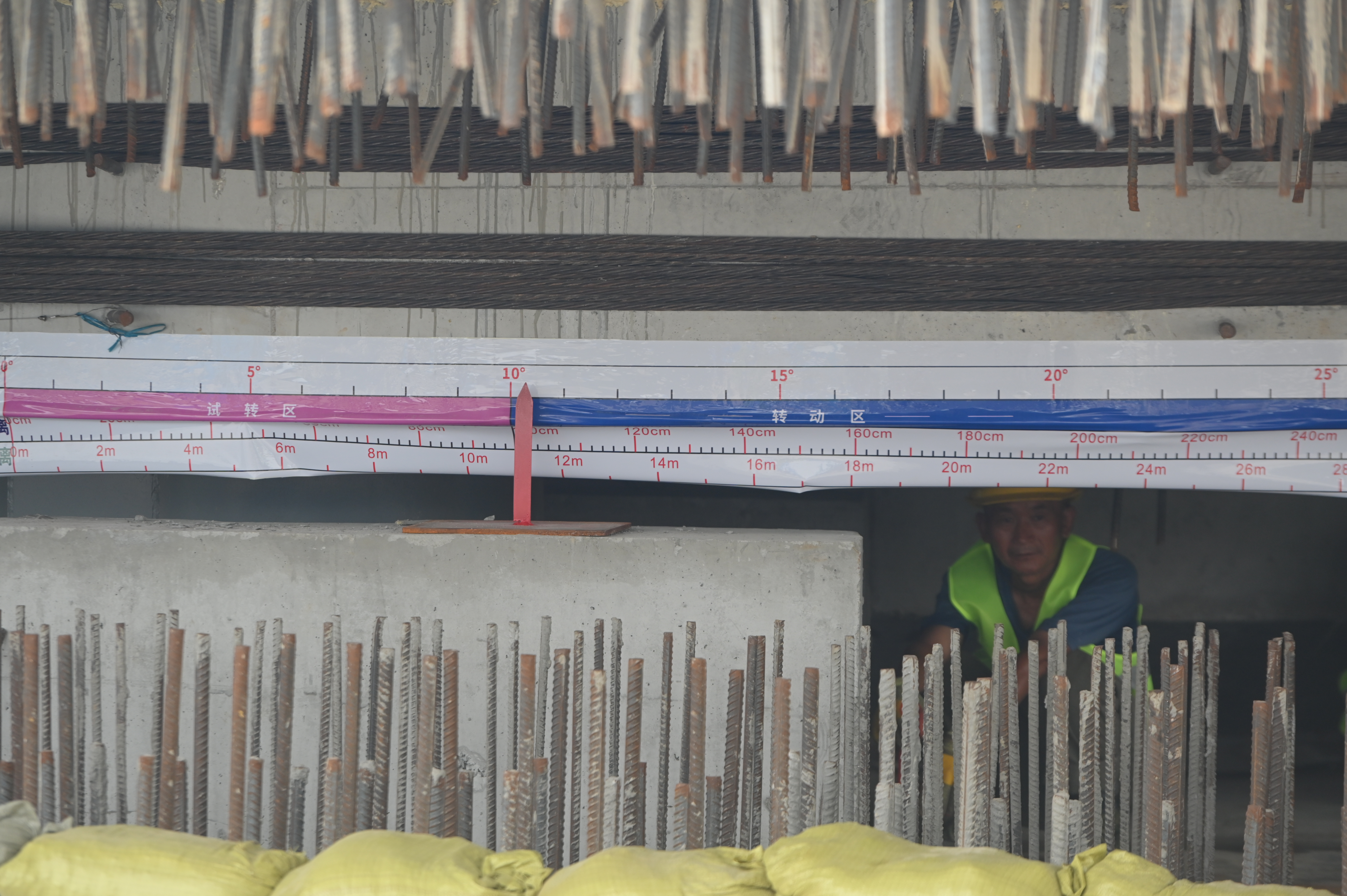 “巨無(wú)霸”轉(zhuǎn)體的背后,全是精細(xì)活兒。轉(zhuǎn)體施工以球鉸為支撐,通過(guò)主控臺(tái)操控智能連續(xù)千斤頂使梁體轉(zhuǎn)動(dòng),撐腳滑道人員實(shí)時(shí)觀測(cè)轉(zhuǎn)體系統(tǒng)受力狀態(tài),根據(jù)轉(zhuǎn)盤上的刻度、編號(hào),實(shí)時(shí)監(jiān)控計(jì)算轉(zhuǎn)動(dòng)數(shù)據(jù),監(jiān)測(cè)風(fēng)力風(fēng)速,確保轉(zhuǎn)體施工進(jìn)度可控、外觀精度準(zhǔn)確、安全系數(shù)達(dá)標(biāo)。