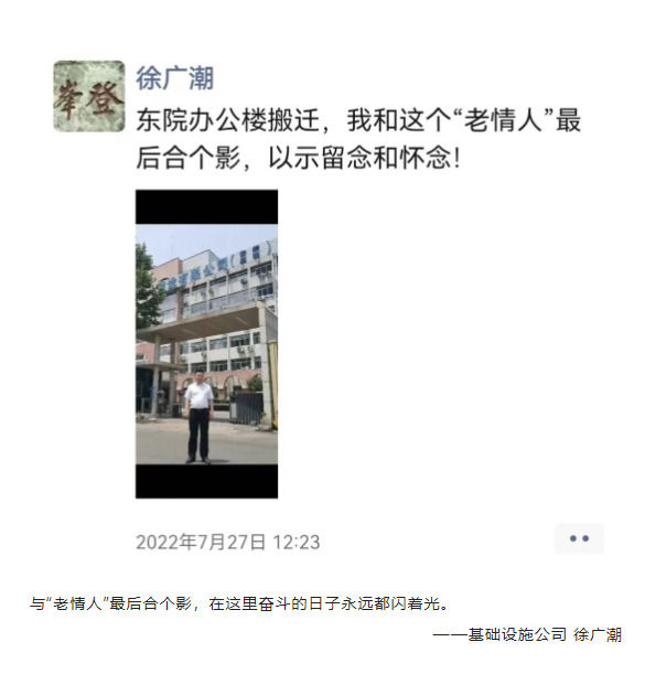 中建八局一公司東院建成于1996年,總建筑面積14430㎡。這棟26歲的“老房”見證了公司的發(fā)展,記錄著幾代八一人的奮斗故事和成長,如今即將分別,大家回憶在這里度過的美好時光,用鏡頭記錄下與“老房”最后的合照。