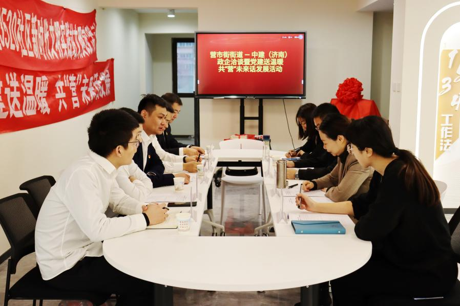 為推動區(qū)域黨建互聯(lián)互動,提升基層黨組織的組織力、凝聚力和戰(zhàn)斗力,12月14日,濟南槐蔭營市街街道辦與濟南雨污分流項目黨支部與共同開展“政企洽談暨黨建聯(lián)建送溫暖 共“營”未來話發(fā)展”活動,營市街街道黨工委副書記、辦事處主任呂健,黨工委副書記、紀檢監(jiān)察工委書記、三級調(diào)研員胡慧敏,中建(濟南)投資建設(shè)有限公司辦公室主任楊恒,中建八局一公司濟南雨污分流項目黨支部書記辛建鑫、專職副書記余帥等參加活動。
