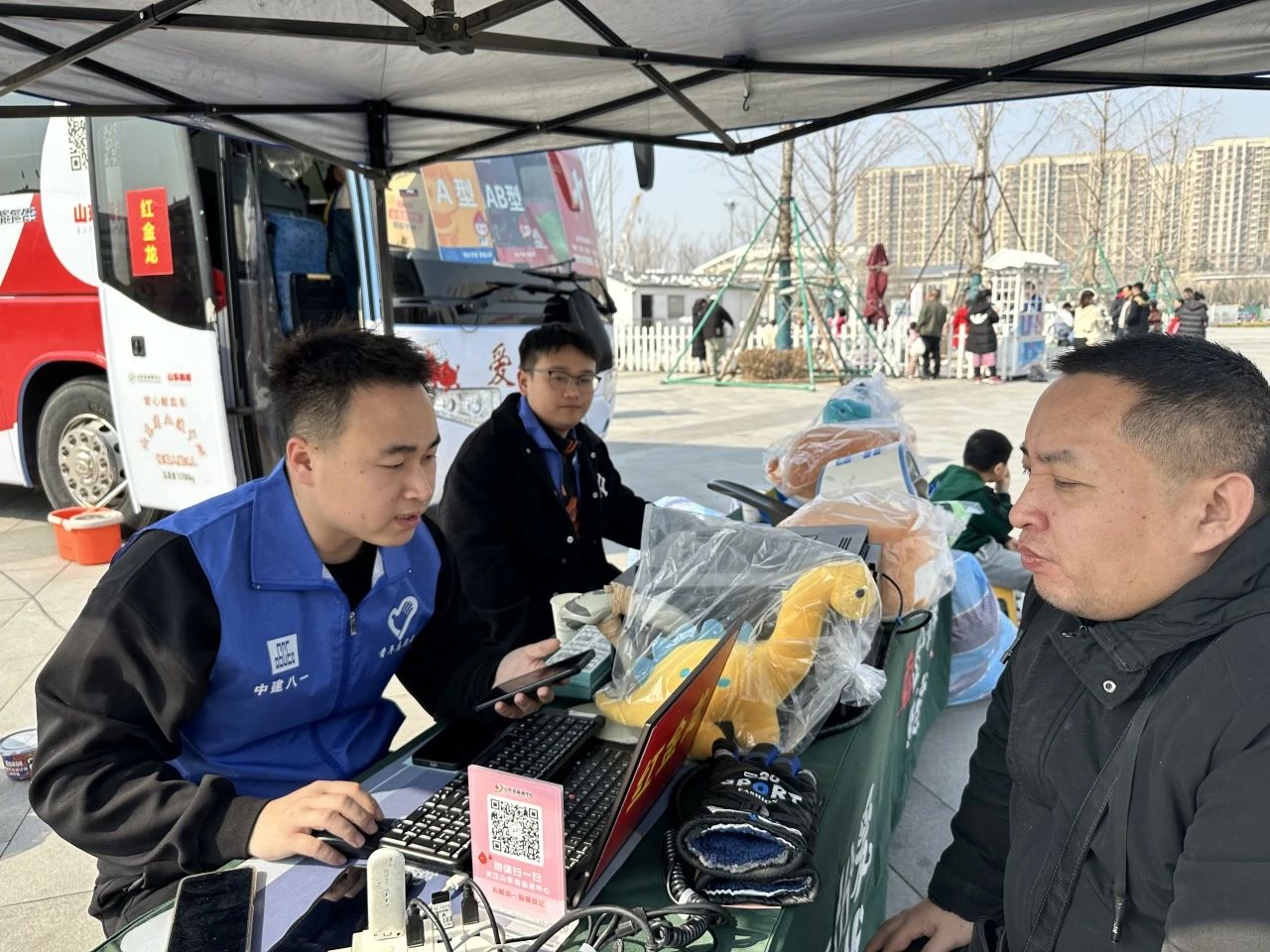 安裝公司“藍(lán)馬甲”青年志愿服務(wù)團(tuán)隊聯(lián)合山東省血液中心流動獻(xiàn)血站,在現(xiàn)場為獻(xiàn)血者登記信息、測量血壓。