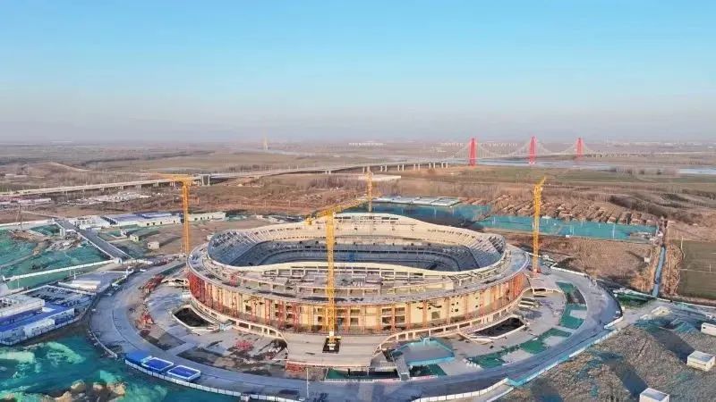 中建八局始終積極融入山東省發(fā)展戰(zhàn)略,服務(wù)綠色低碳高質(zhì)量發(fā)展先行區(qū)建設(shè),以一座座精品工程,助推塑造山東高質(zhì)量發(fā)展新優(yōu)勢。黃河體育中心專業(yè)足球場項(xiàng)目位于濟(jì)南新舊動能轉(zhuǎn)換起步區(qū),總建筑面積19.7萬平方米,是山東省首個(gè)6萬座專業(yè)足球場,目前世界最大的單層PTFE網(wǎng)格覆膜結(jié)構(gòu)工程,足球場屋頂覆膜結(jié)構(gòu)面積約4.3萬平方米,為同類建筑之最、透光率是世界最高。目前,項(xiàng)目已完成下部鋼結(jié)構(gòu)施工,即將進(jìn)入屋蓋鋼結(jié)構(gòu)施工階段。
