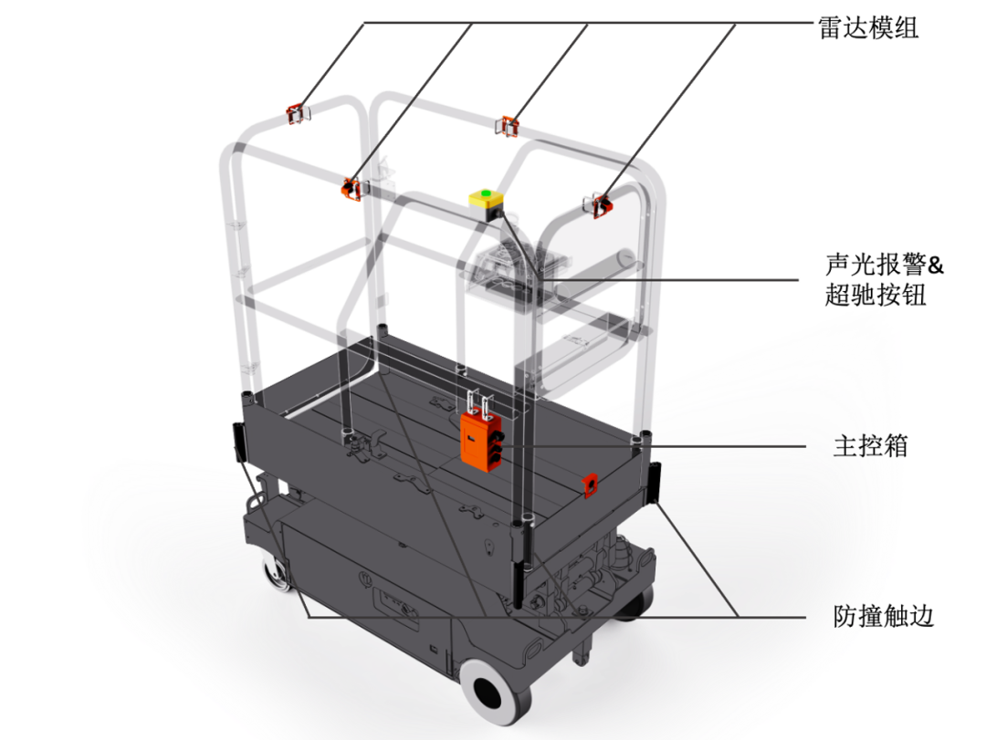 剪叉式升降平臺(tái)是一種廣泛應(yīng)用于高處作業(yè)的機(jī)械設(shè)備,由于作業(yè)環(huán)境復(fù)雜多變,傳統(tǒng)平臺(tái)面對(duì)周邊障礙物完全依靠操作人員預(yù)判風(fēng)險(xiǎn),無(wú)法實(shí)現(xiàn)主動(dòng)預(yù)警、緊急制動(dòng),導(dǎo)致作業(yè)過程存在安全隱患。