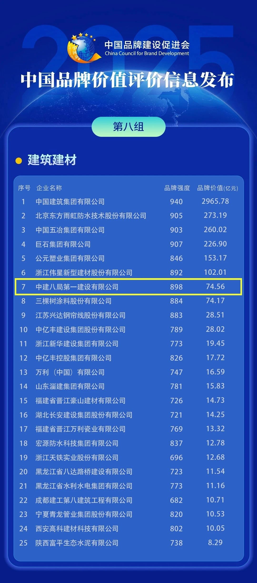 5月10日,由中國品牌建設(shè)促進會、中國資產(chǎn)評估協(xié)會主辦,新華社品牌工作辦公室、《中國品牌》雜志社等單位承辦的“2025中國品牌價值評價信息”在浙江德清正式發(fā)布。中建八局一公司以品牌強度898、品牌價值74.56億元,位列建筑建材組第7位,較去年再進1位。