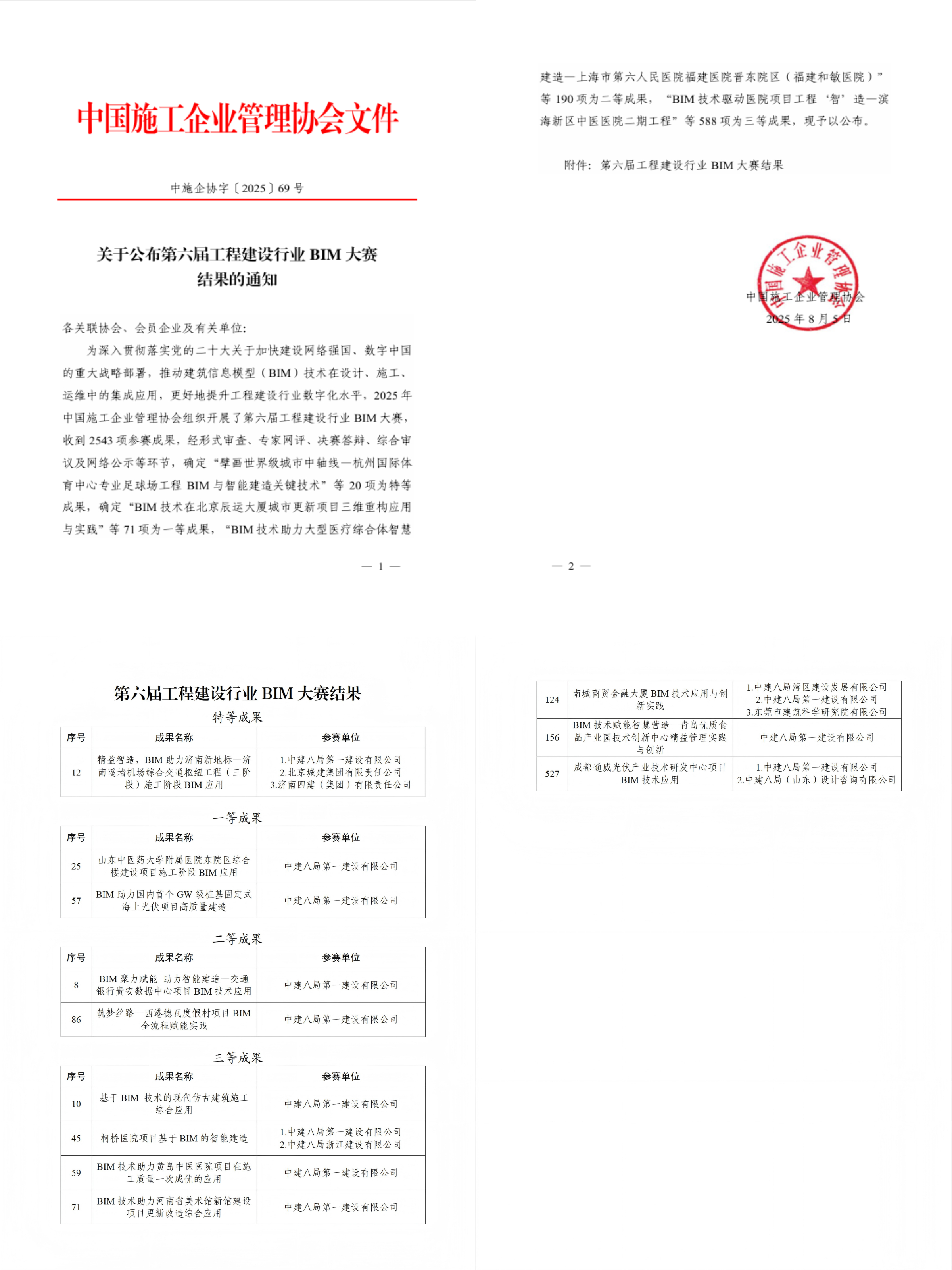 近日,中國施工企業(yè)管理協(xié)會正式公布第六屆工程建設(shè)行業(yè)BIM大賽成果,中建八一榮獲特等成果1項、一等成果2項、二等成果2項、三等成果7項,獲獎項目涵蓋機(jī)場建設(shè)、醫(yī)療衛(wèi)生、海上光伏、仿古建筑、工業(yè)園區(qū)等多個領(lǐng)域,充分展現(xiàn)公司智能建造與數(shù)字轉(zhuǎn)型領(lǐng)域特色優(yōu)勢。