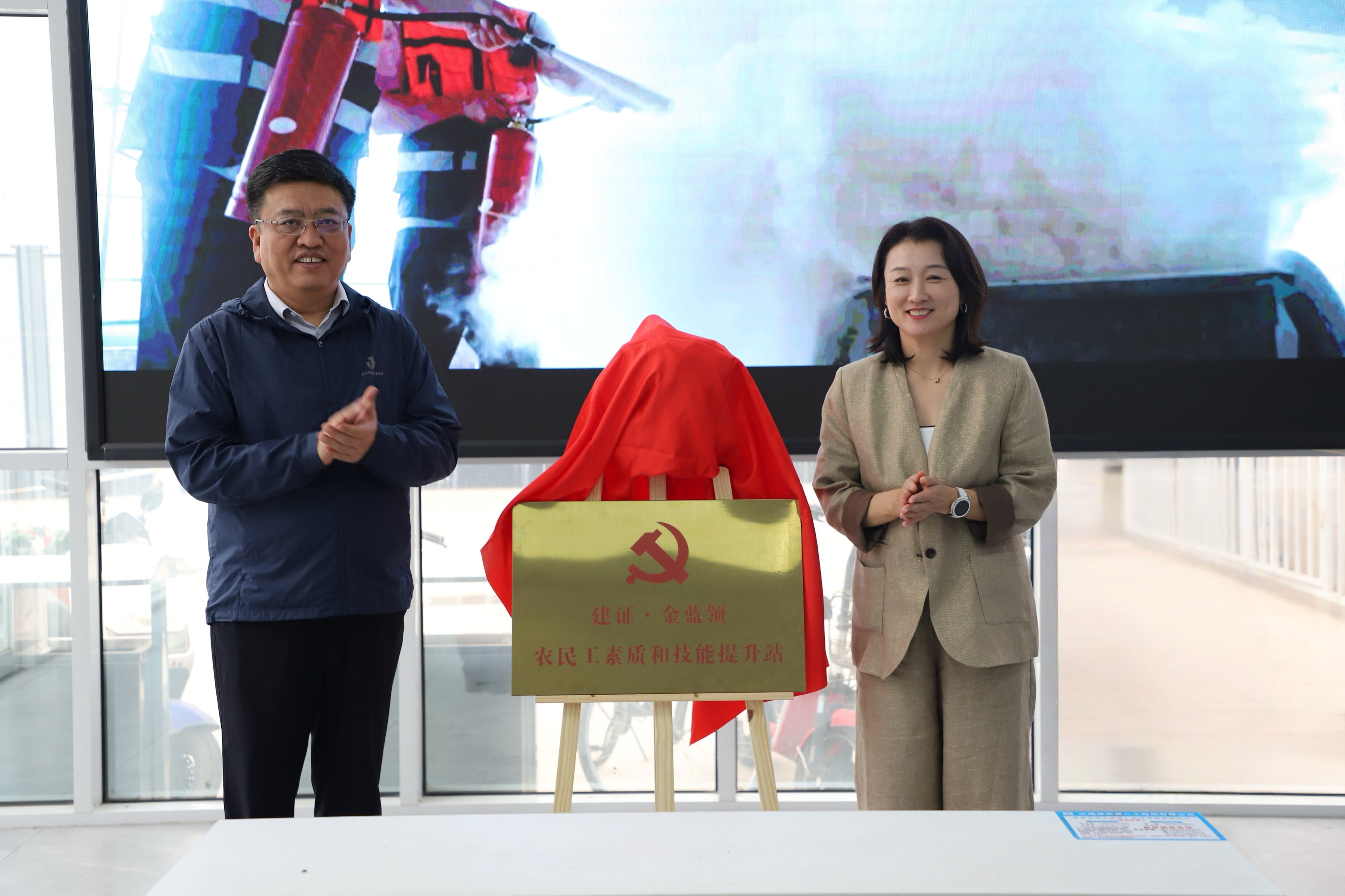 期間,譚博一行參觀了項(xiàng)目綜合展廳、工友綜合服務(wù)中心與工友生活區(qū),詳細(xì)了解項(xiàng)目建設(shè)進(jìn)展與生活工作條件,對項(xiàng)目工會工作開展情況給予肯定。譚博、聶麗共同為項(xiàng)目“建證·金藍(lán)領(lǐng)”農(nóng)民工素質(zhì)和技能提升站揭牌。