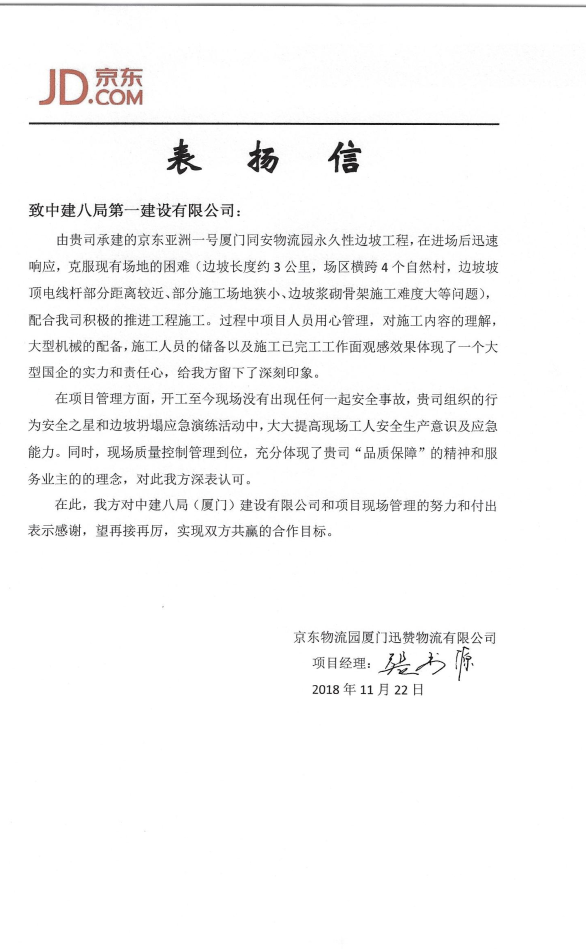 廈門京東物流園項(xiàng)目喜獲業(yè)主表?yè)P(yáng)信