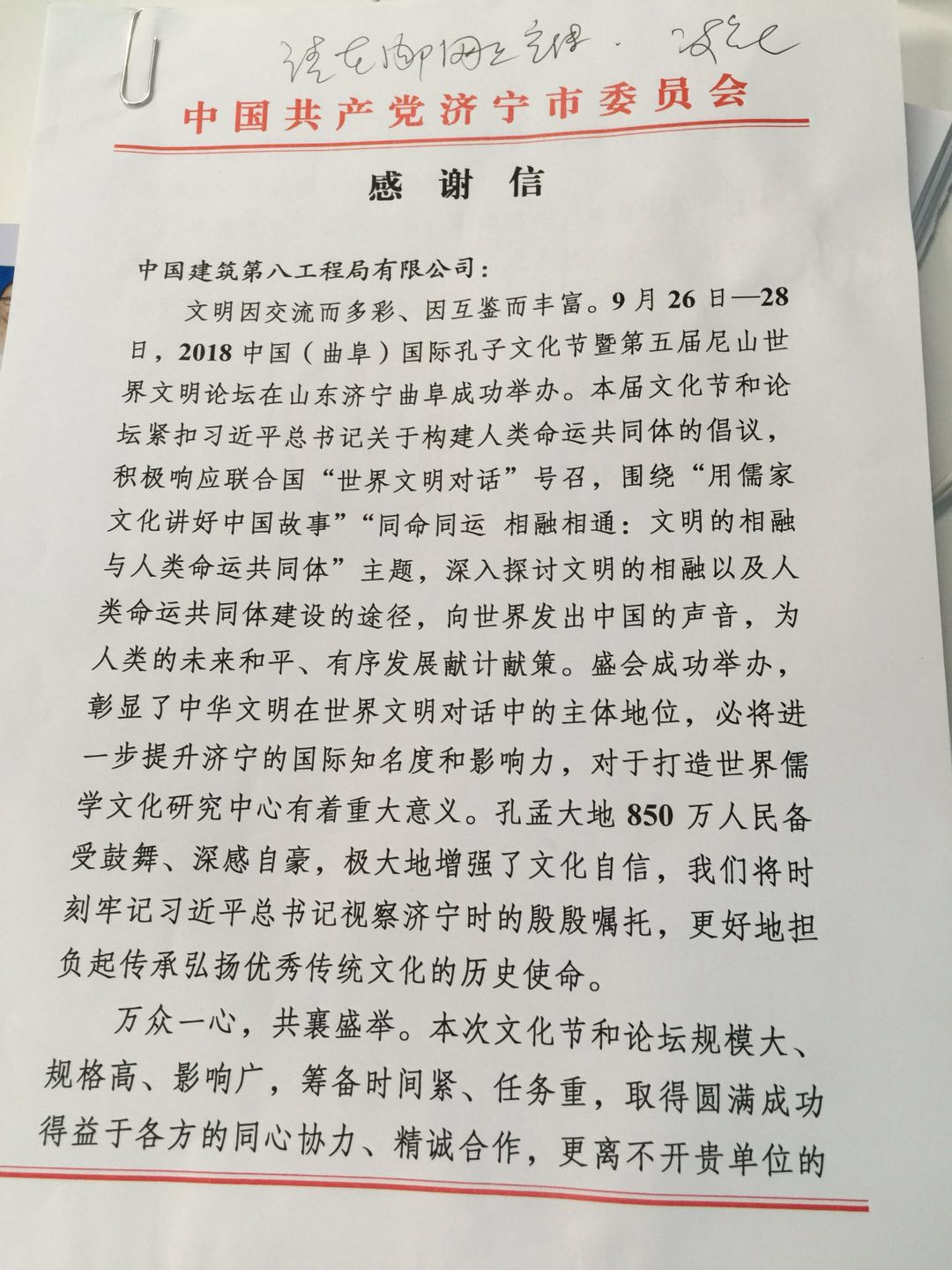 近日,中共濟(jì)寧市委、濟(jì)寧市人民政府向中建八局發(fā)來表揚(yáng)信。 對由中建八局一公司承建的曲阜尼山圣境項(xiàng)目為2018中國(曲阜)國際孔子文化節(jié)暨第五屆尼山世界文明論壇成功舉辦做出的貢獻(xiàn)表示衷心的感謝。