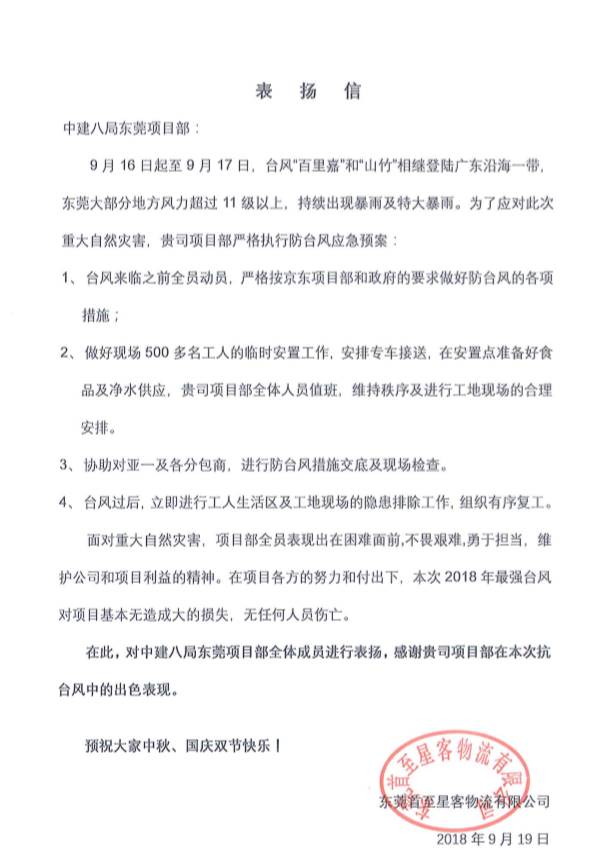 近期,東莞京東項目接到來自業(yè)主東莞首至星客物流有限公司的表揚信,對項目部全體成員應(yīng)對超強臺風(fēng)“山竹”的出色表現(xiàn)進(jìn)行表揚及感謝。