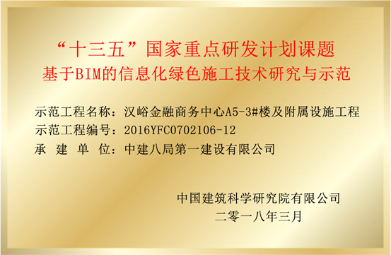 8月15日,漢峪金融商務(wù)中心A5-3#樓及附屬設(shè)施工程“雙喜臨門”,由中國(guó)建筑科學(xué)研究院頒發(fā)的“十三五”國(guó)家重點(diǎn)研發(fā)計(jì)劃課題《基于BIM的信息化綠色施工技術(shù)研究與示范》銅牌和中建八局頒發(fā)的“二0一八年度科技成果轉(zhuǎn)化示范工程”銅牌在我項(xiàng)目成功掛牌立項(xiàng)。