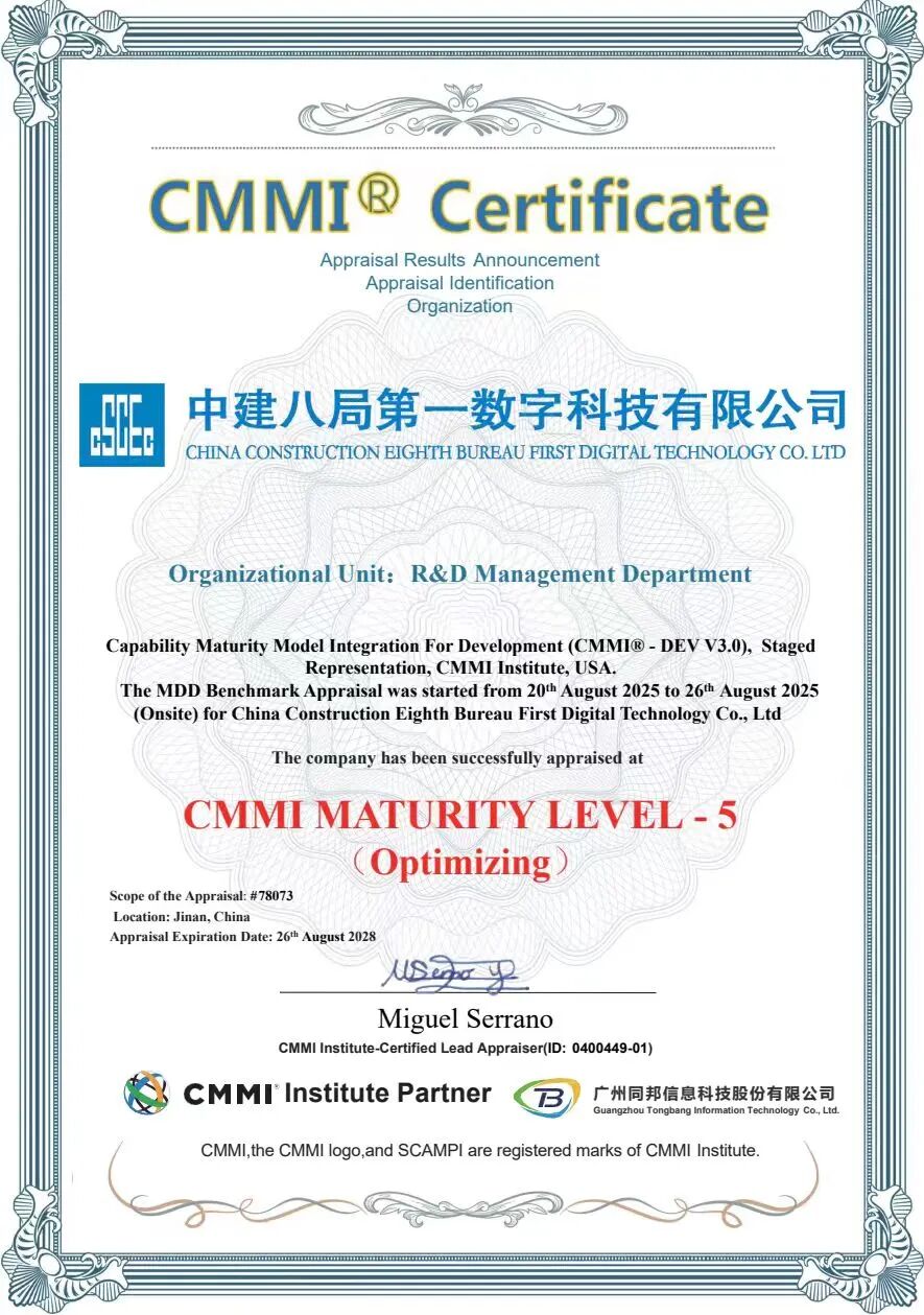 近日,中建八局第一數(shù)字科技有限公司成功通過 CMMI-DEV V3. 0 成熟度五級(簡稱 CMMI5 級)認(rèn)證,該認(rèn)證是全球軟件領(lǐng)域的最高級別認(rèn)證,標(biāo)志著公司在軟件研發(fā)、流程化管理與交付運維能力上達(dá)到行業(yè)一流水平,數(shù)字化轉(zhuǎn)型取得關(guān)鍵成效。