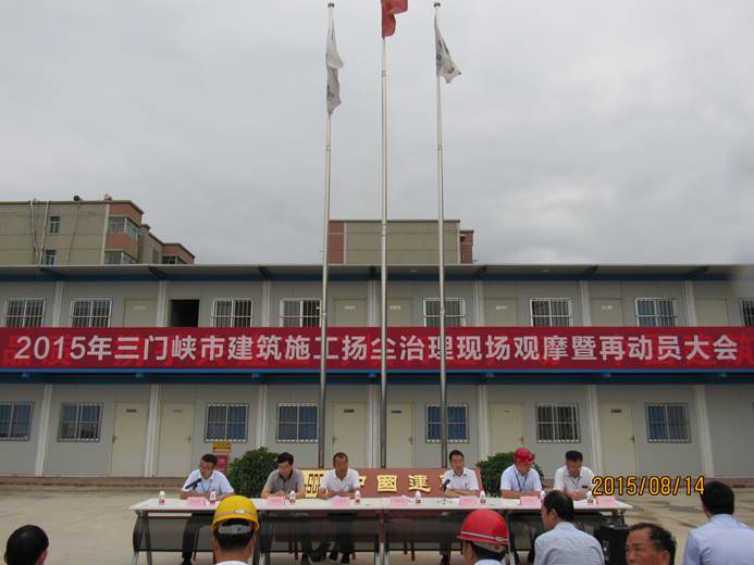 在項目會議室,楊青黑局長作了發(fā)言,三門峽萬達(dá)廣場投資有限公司總經(jīng)理葉斌、項目負(fù)責(zé)人孫金輝、建研凱勃項目總監(jiān)金成春先后介紹了現(xiàn)場揚塵管理措施;董清華副局長、石順剛副局長,重點宣講了揚塵治理百日行動專項方案。