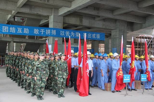 “發(fā)揚(yáng)鐵軍精神,頑強(qiáng)拼搏,奮勇?tīng)?zhēng)先,精細(xì)管理,精心施工,全面完成建設(shè)任務(wù)!為龍湖天街工程建設(shè)再立新功!”8月13日上午,上海龍湖天街項(xiàng)目舉行的立功競(jìng)賽暨三號(hào)聯(lián)創(chuàng)、創(chuàng)“雙優(yōu)”、準(zhǔn)軍事化管理啟動(dòng)儀式上,近200名管理人員和建設(shè)者鄭重宣誓。