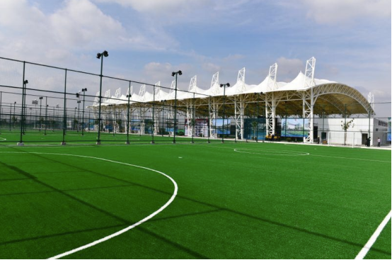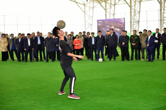觀摩展示區(qū)位于一塊7人制的風雨球場中,球場采用了膜結(jié)構(gòu),潔白的“外殼”將綠色的足球世界擁抱其中,交相輝映。觀摩團在這個球場里觀看了濱州國際足球運動小鎮(zhèn)的宣傳視頻,并欣賞了足球運動健兒的花式足球表演。