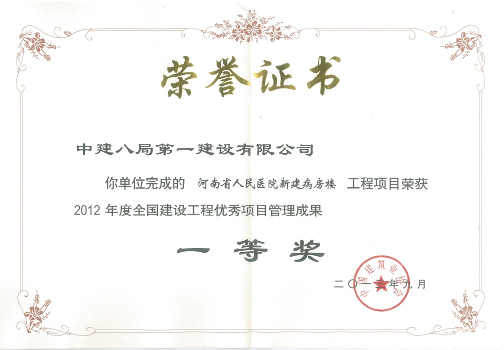 河南省人民醫(yī)院新建病房樓項(xiàng)目榮獲“全國(guó)建設(shè)工程優(yōu)秀項(xiàng)目管理成果”一等獎(jiǎng)