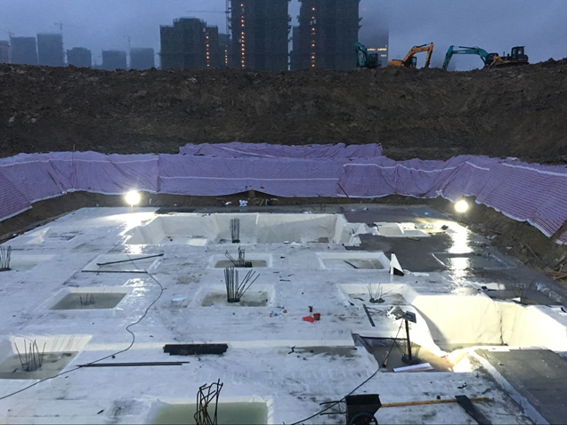 施工期間,合肥出現(xiàn)了二十幾天的連續(xù)陰雨天氣,基坑支護未施工,出現(xiàn)了多處土方坍塌,新澆墊層被埋。面對種種困難,項目部迎難而上,調(diào)集了九臺大挖,24h連續(xù)作業(yè),保證了基坑的安全。