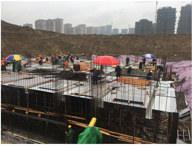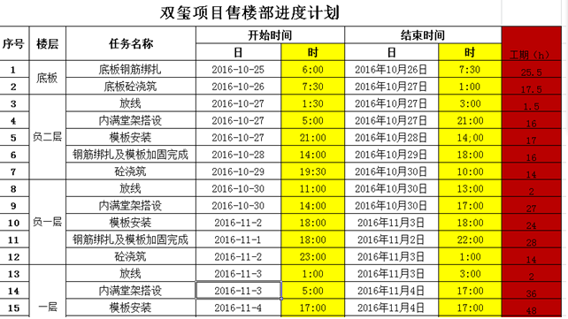 售樓部主體施工期間,項目部編制了詳細(xì)的施工進度計劃,計劃精確到小時,24小時兩班輪流不間斷施工,保證了地下室兩層和地上一層主體結(jié)構(gòu)在20天內(nèi)的完成。