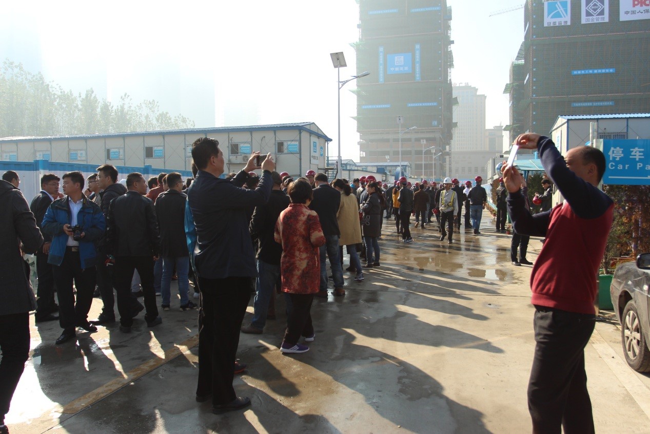 11月5日,與會各施工企業(yè)代表共赴此次交流會唯一指定觀摩工地――安徽分公司中國人保財險華東中心一期工程,觀摩項目綠色施工典型做法。光伏發(fā)電、空氣能熱水器、太陽能路燈、雨水收集系統(tǒng)、循環(huán)水車輛沖洗系統(tǒng)、智能化環(huán)境監(jiān)測系統(tǒng)、裝配式圍擋等十幾項綠色施工的先進工藝、技術(shù)引起了觀摩團的極大興趣,大家一邊觀看,一邊舉起手機拍照,詳細記錄項目的先進經(jīng)驗、典型做法。