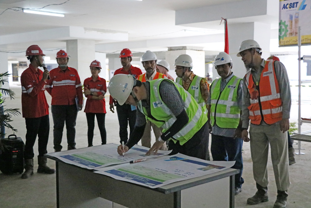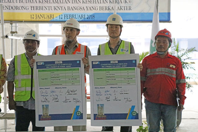 早上七時三十分,活動正式開始,主持人致辭并宣讀了本年度安全生產(chǎn)月活動主題及啟動儀式的主要流程。活動儀式上,總監(jiān)理工程師Dedi宣讀了印尼勞工部關(guān)于建筑行業(yè)安全生產(chǎn)的相關(guān)法律和法規(guī),安全部經(jīng)理Iswanto就2017年項目安全生產(chǎn)活動進行總結(jié)報告,詳細回顧了過去一年里項目在安全管理方面取得的一系列成績,并就2018年安全管理目標(biāo)進行了展望?;顒舆€對項目2018年度安全生產(chǎn)活動進行了詳細部署,項目經(jīng)理劉嘉東等主要管理人員簽訂了目標(biāo)責(zé)任狀。