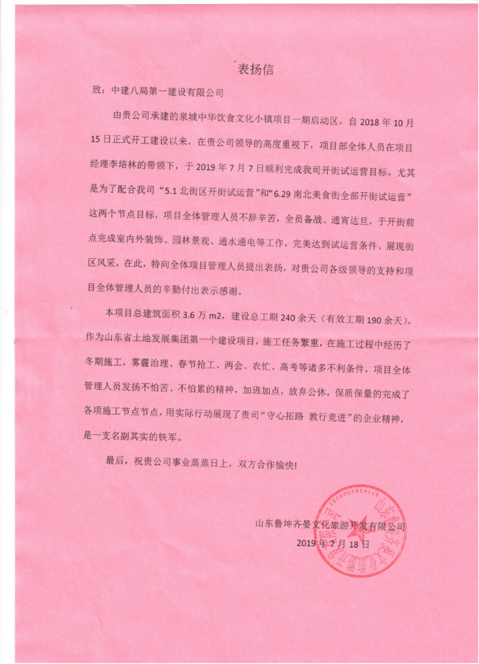 7月22日,泉城中華飲食文化小鎮(zhèn)項(xiàng)目收到山東魯坤齊晏文化旅游開發(fā)有限公司對(duì)公司及項(xiàng)目部的表揚(yáng)信。