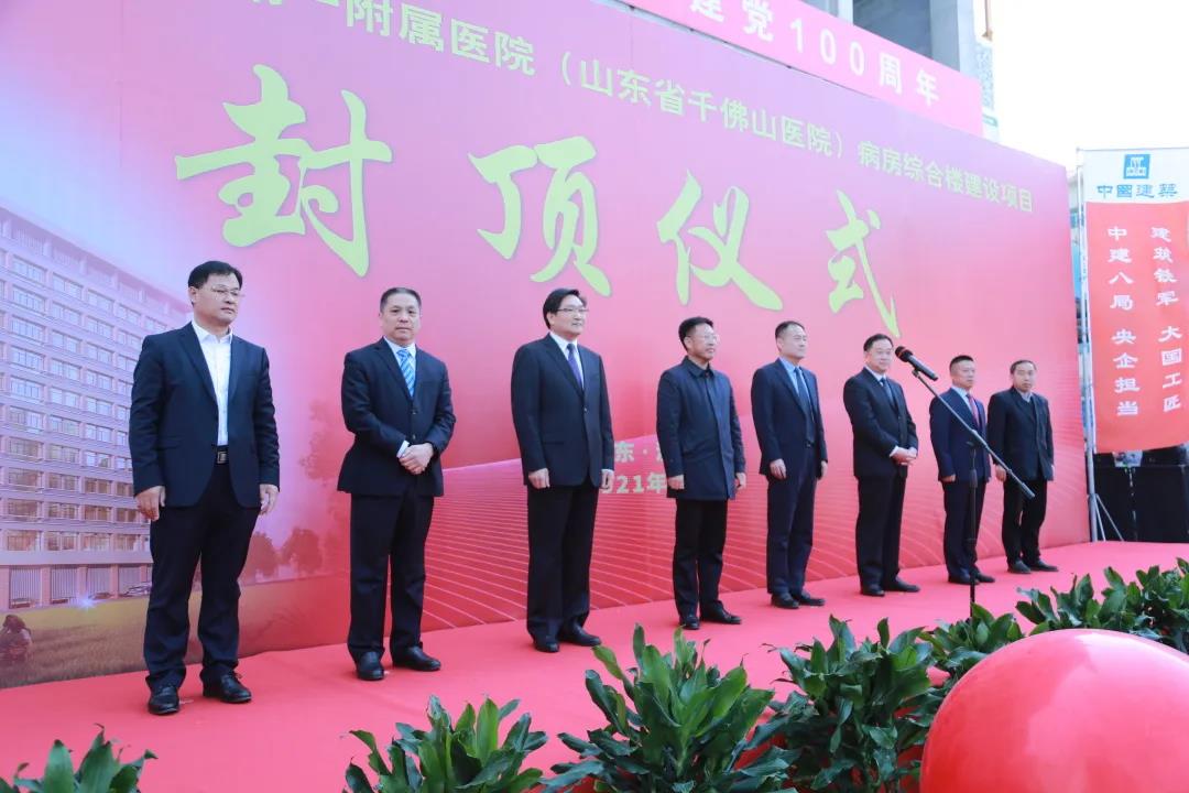 山東第一醫(yī)科大學(xué)(山東省醫(yī)學(xué)科學(xué)院)黨委委員、副校長姚慶強(qiáng)出席儀式,并宣布項目封頂。千佛山醫(yī)院黨委書記王一兵,黨委副書記、院長胡三元,黨委副書記劉亞民,總會計師張永征,副院長兼工會主席劉效良,副院長許翠萍;山東普華項目管理有限公司總經(jīng)理路公高;中建八局一公司副總經(jīng)理劉明等出席儀式。