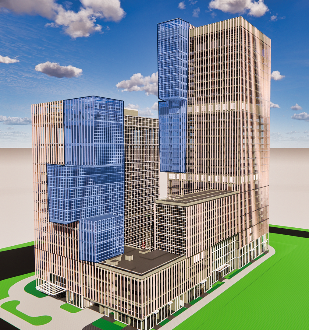 A1塔樓外立面造型錯(cuò)落,擁有多處鋼結(jié)構(gòu)懸排區(qū)域,總懸挑重量達(dá)1500噸,項(xiàng)目團(tuán)隊(duì)?wèi)?yīng)用BIM技術(shù)全周期管理,通過BIM輔助圖紙會(huì)審,累計(jì)解決圖紙問題100余項(xiàng),避免了800余處施工位置沖突。