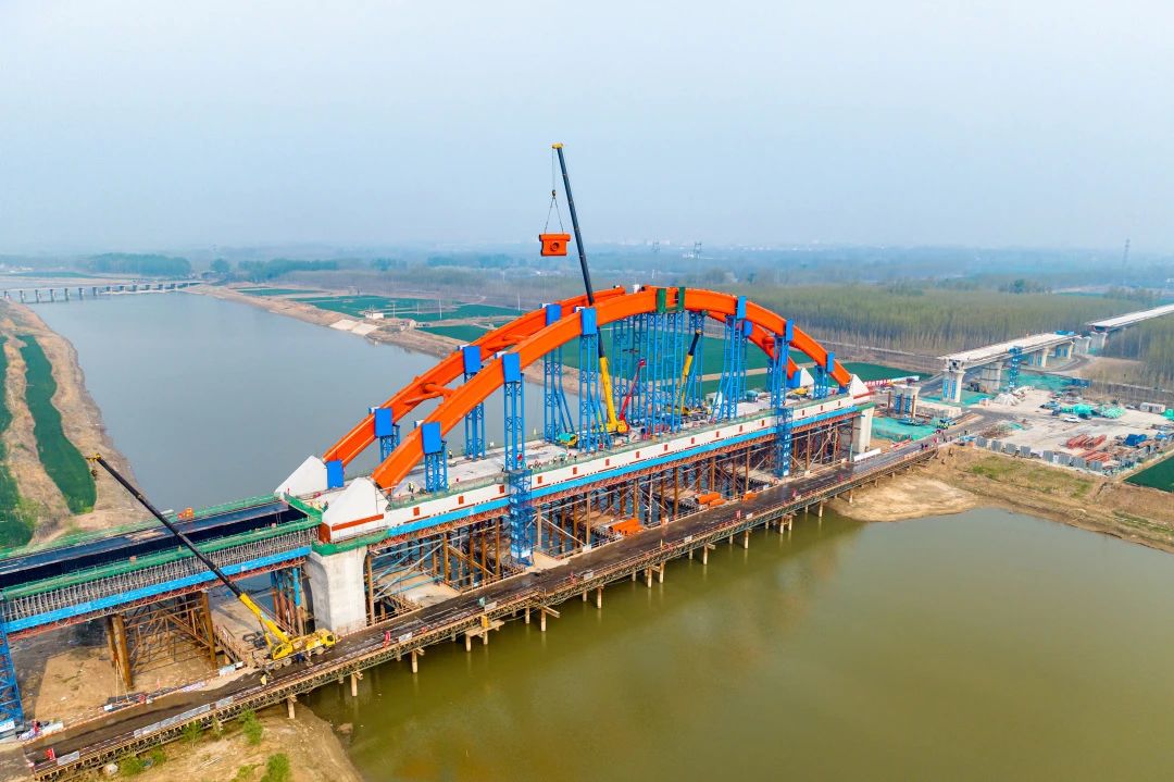 此次拱橋拱肋合龍段為濟商1號特大橋跨徒駭河144米系桿拱,位于濟南市濟陽區(qū),總長148米、最大跨度144米、拱肋矢高28.52米,總用鋼量達(dá)840余噸,是連通濟陽區(qū)和商河縣高鐵的唯一紐帶,也是全線重要控制性節(jié)點,涉及特殊結(jié)構(gòu)物多、水中作業(yè)復(fù)雜等特點,是項目全線的“咽喉”工程。